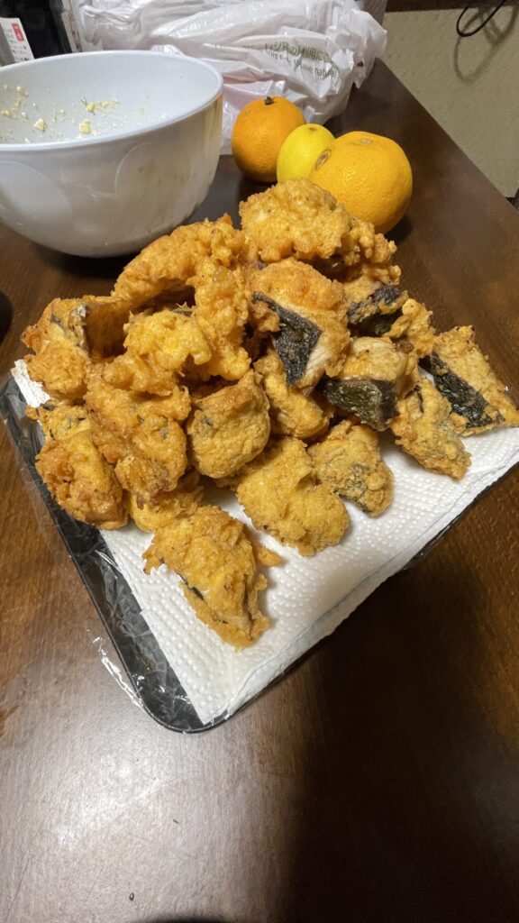 ヒラマサのフライ。かなりの厚衣でザックザクでうまい。