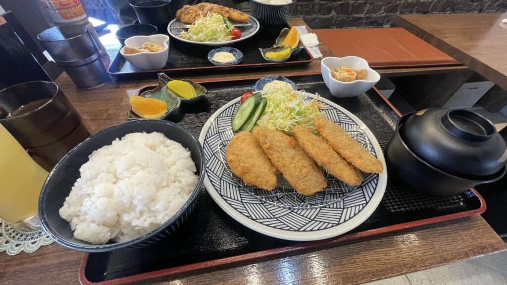 今日は友達とアジフライ定食を食べに来てます。