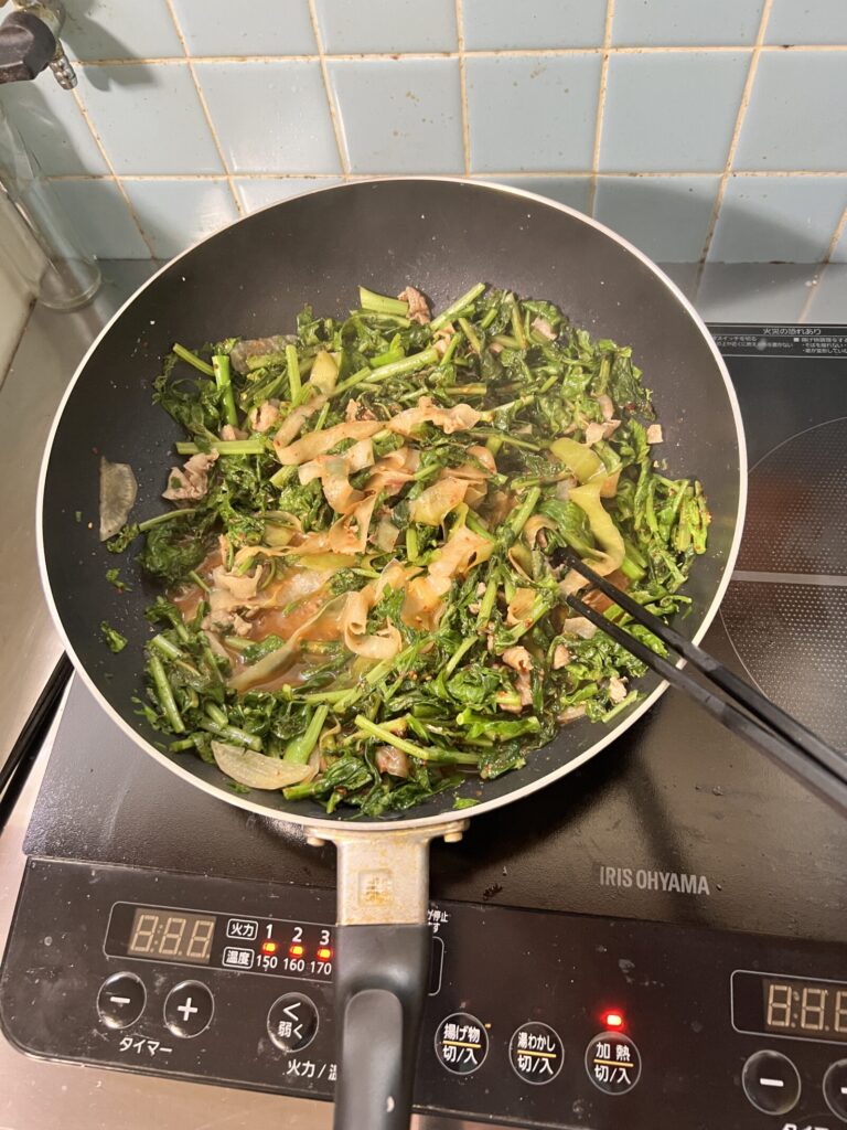 むいた大根の皮と大根の葉っぱを炒めていく。