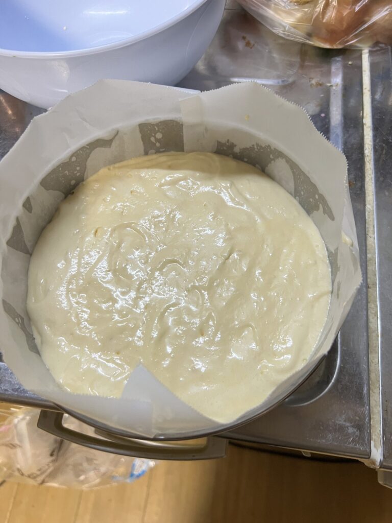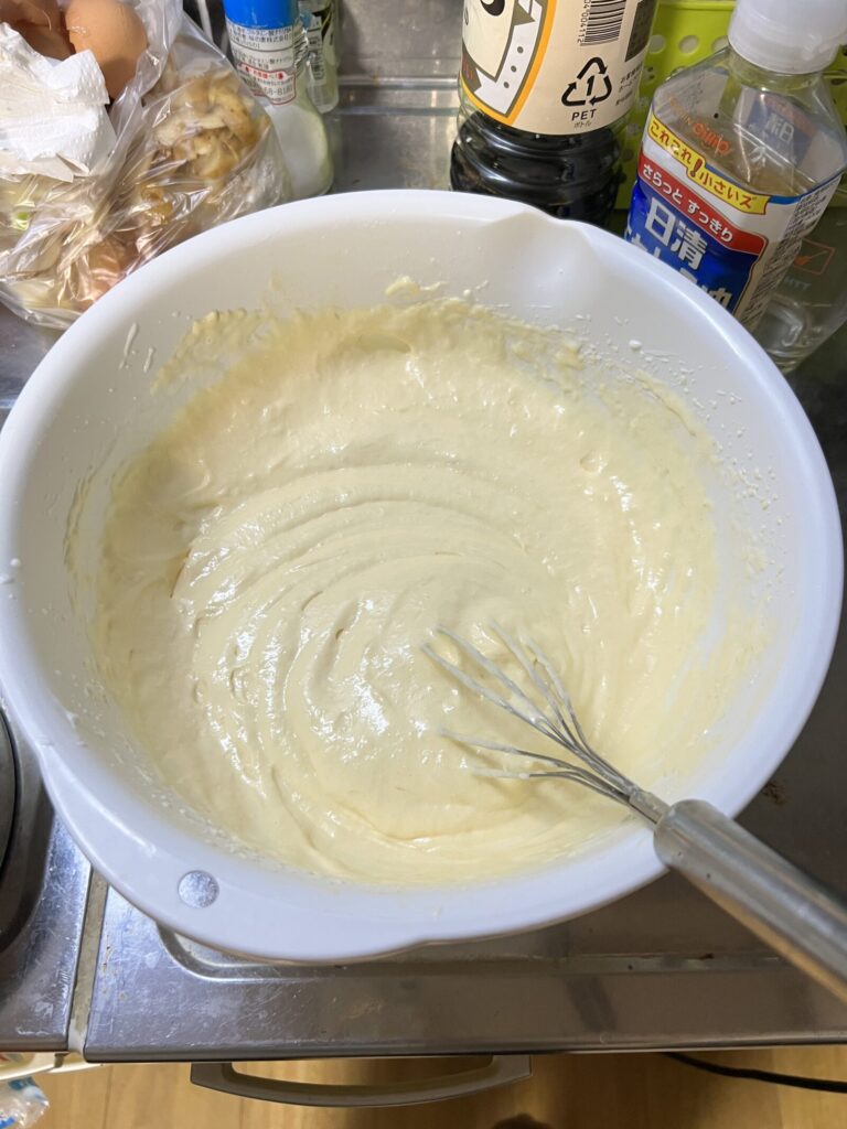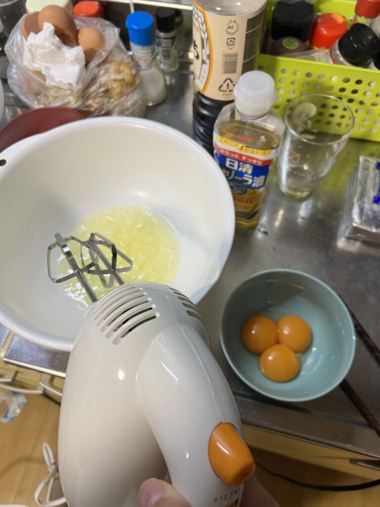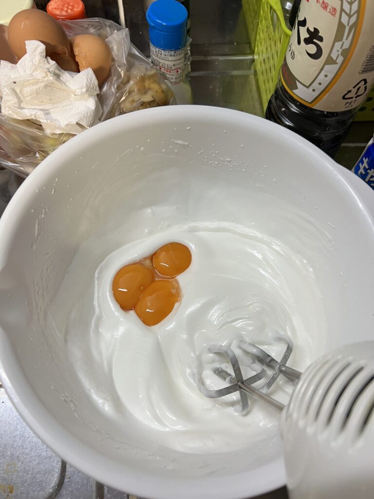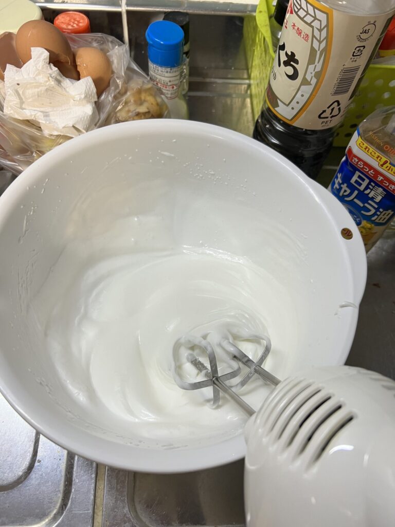 先に白身を泡立ててから黄身を入れて泡立てると泡立ちが早いしよりきめ細かくなるんだとか。