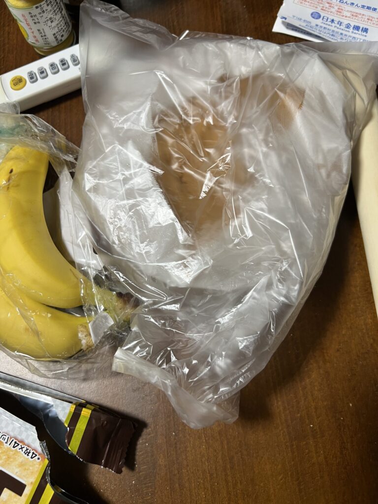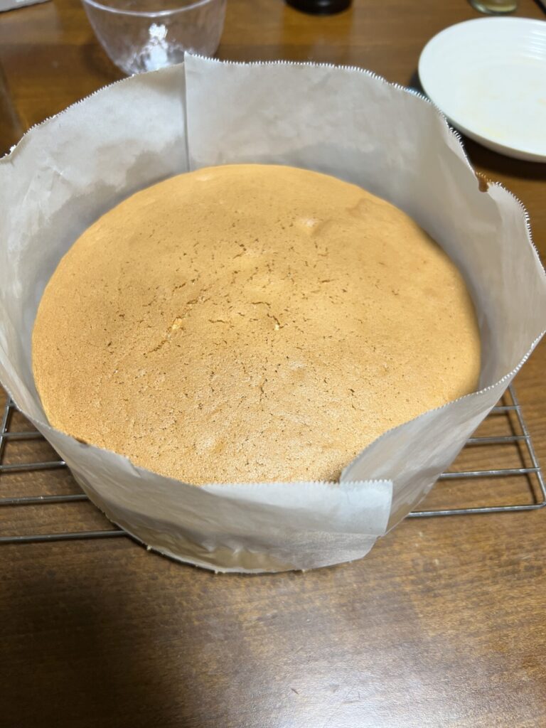 スポンジケーキは焼き上がりに高いところから落として中の蒸気を抜いたらこうやって袋の中に入れておくとしっとりふんわりするんだってさ。