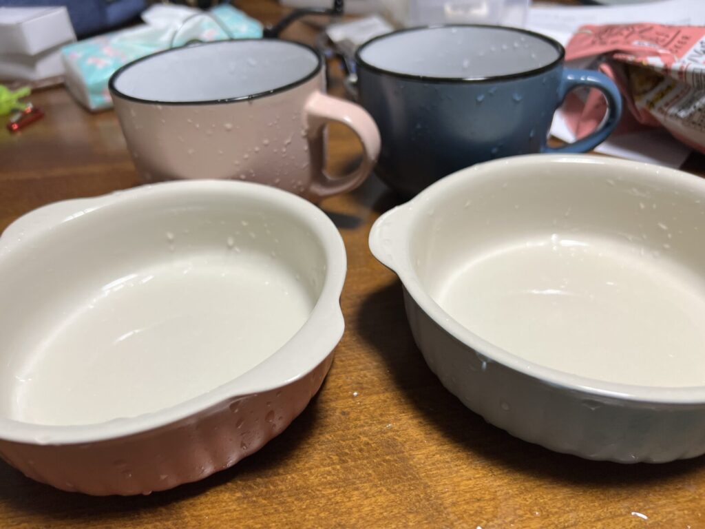ピンクと青のマグカップとグラタン皿。