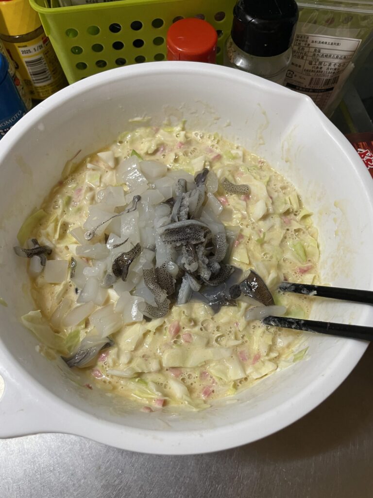 今日は自分が釣ったアオリイカを使用したお好み焼きを作っていきます。