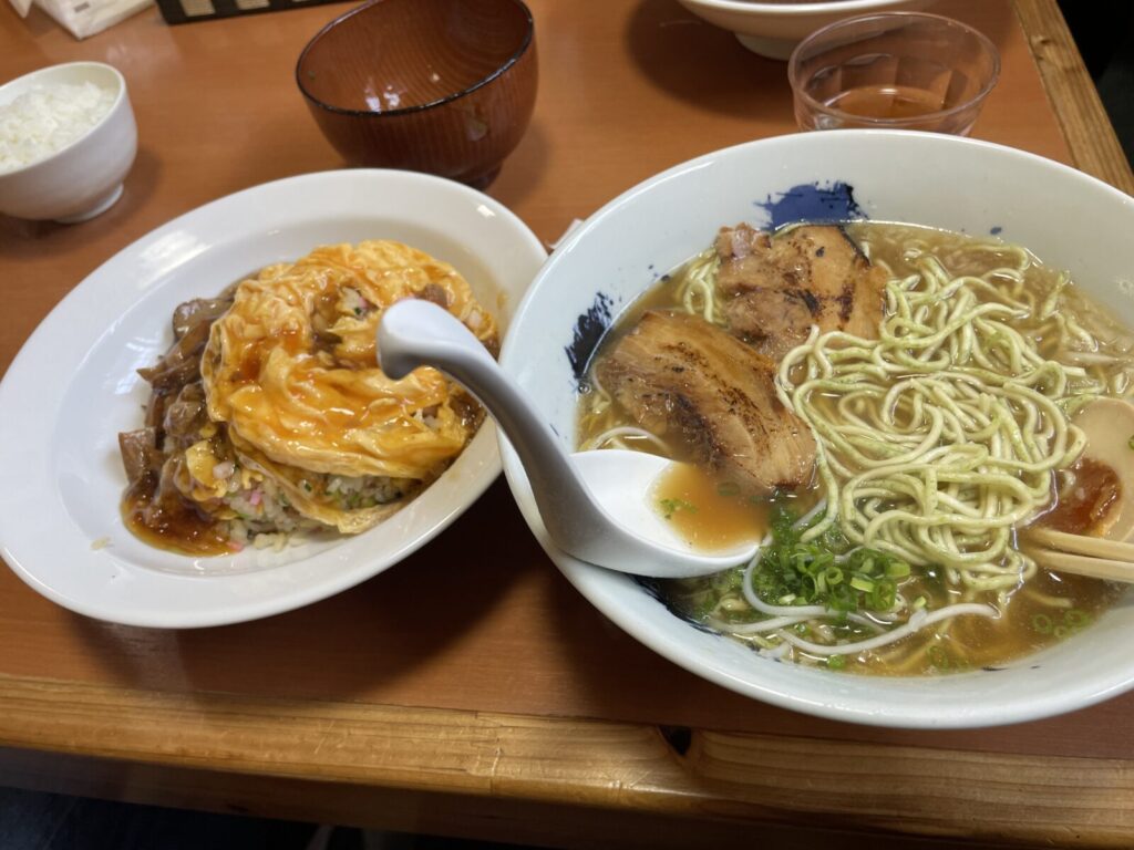 あおさ2層麺の醤油とんこつに欲張りチャーハン。