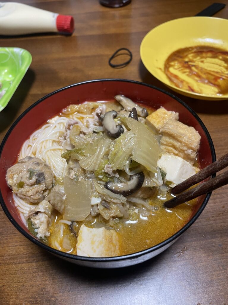 夜ご飯は鍋にそうめんを入れてみたけどこれはあんまり合わないわ。
